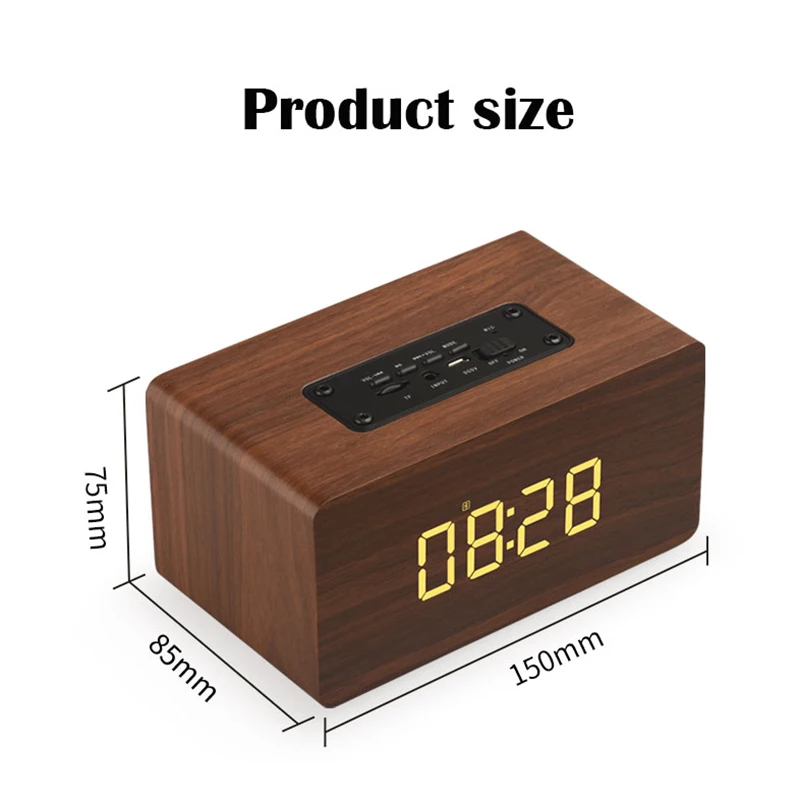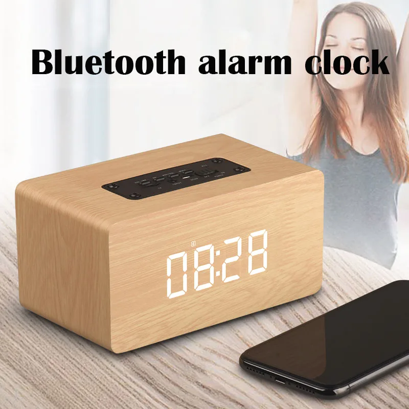 Retro Bluetooth Digital LED Alarm Clock Backlight Display Bass Diaphragm Portable Wooden Desktop Cl